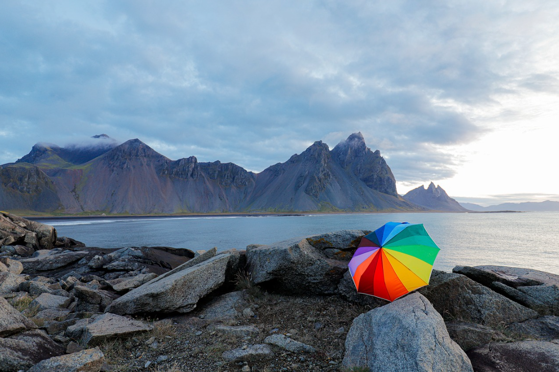 회색 바위 위에 덩그러니 놓인 무지개색 우산 하나가