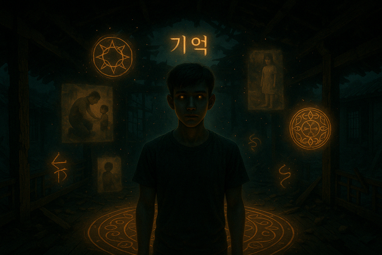 [기억의 봉인] - 4화. 죽은 자의 이름을 부르면 [5화. 봉인 밖으로 흘러나온 것들] 꿈은 아니었다.그러나 현실도 아니었다.진우는 자신이 걷고 있는 바닥이 낡은 나무라는 것을 깨닫는 데까지 몇 초가 걸렸다.미세하게 삐걱거리는 소리, 창호지에 새겨진 햇살 무늬,그리고 불규칙하게 울리는 시계의 '똑딱' 소리.그는 어느 오래된 한옥 안에 서 있었다."이곳은... 어디지...?"주위를 둘러봤다.복도는 길고 정적에 잠겨 있었다.벽에는 오래된 병풍이 펼쳐져 있었고,벽 너머에서는 가끔 아이들의 웃음소리가 스쳤다.그러나 아무도 보이지 않았다.한 발, 또 한 발.그는 어딘가에 이끌리듯 걷기 시작했다.그러다 복도 끝의 작은 마루 위에 앉아 있는 아이를 보았다.그 아이는 고개를 들고 있었다.눈동자는 짙은 검은색.그러나 ..